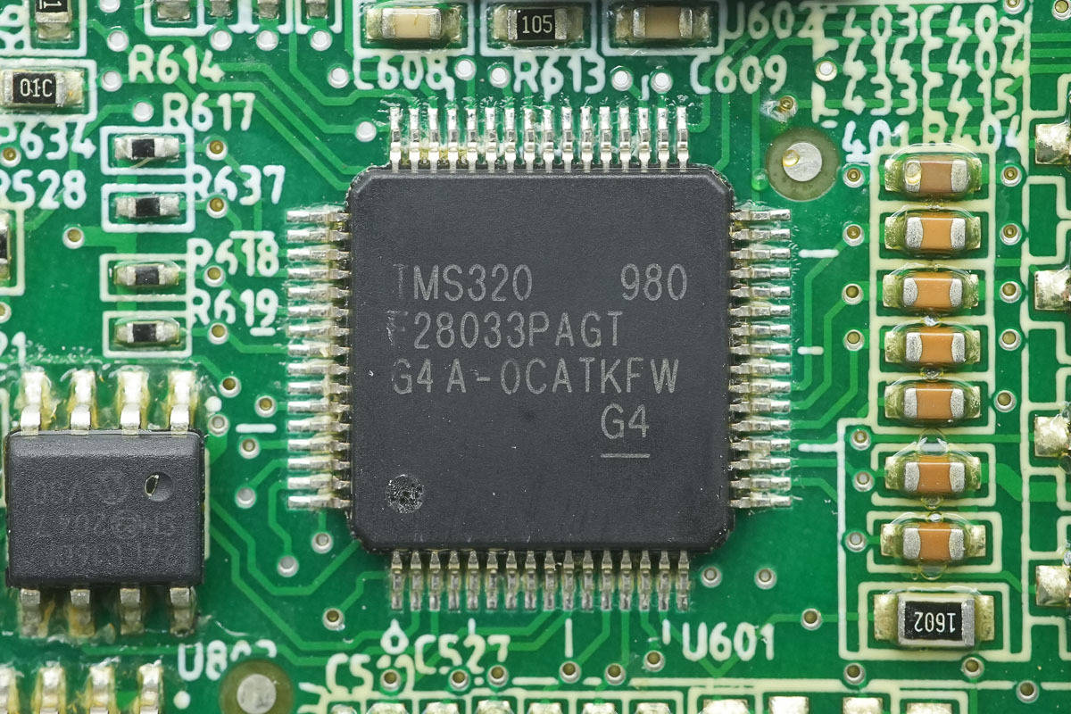 控制器来自德州仪器,型号TMS320F28033,芯片内置C2000 32位MCU,主频为60MHz,内置64KB FLASH和20KB RAM,采用TQFP64封装。