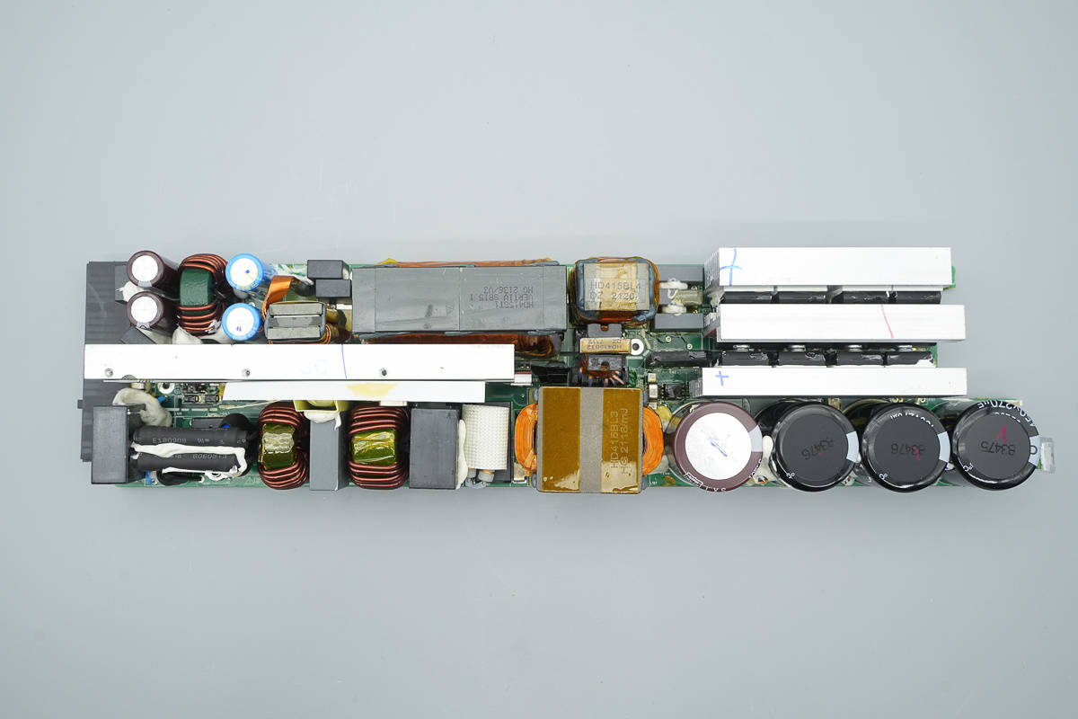 PCBA模块正面一览,左侧下方为交流输入端,设有安规X2电容,保险丝,压敏电阻,共模电感,继电器和启动电阻。中间下方为PFC电感,右侧下方设有四颗高压滤波电容。滤波电容上方散热片为PFC开关管,PFC整流管和LLC开关管。
