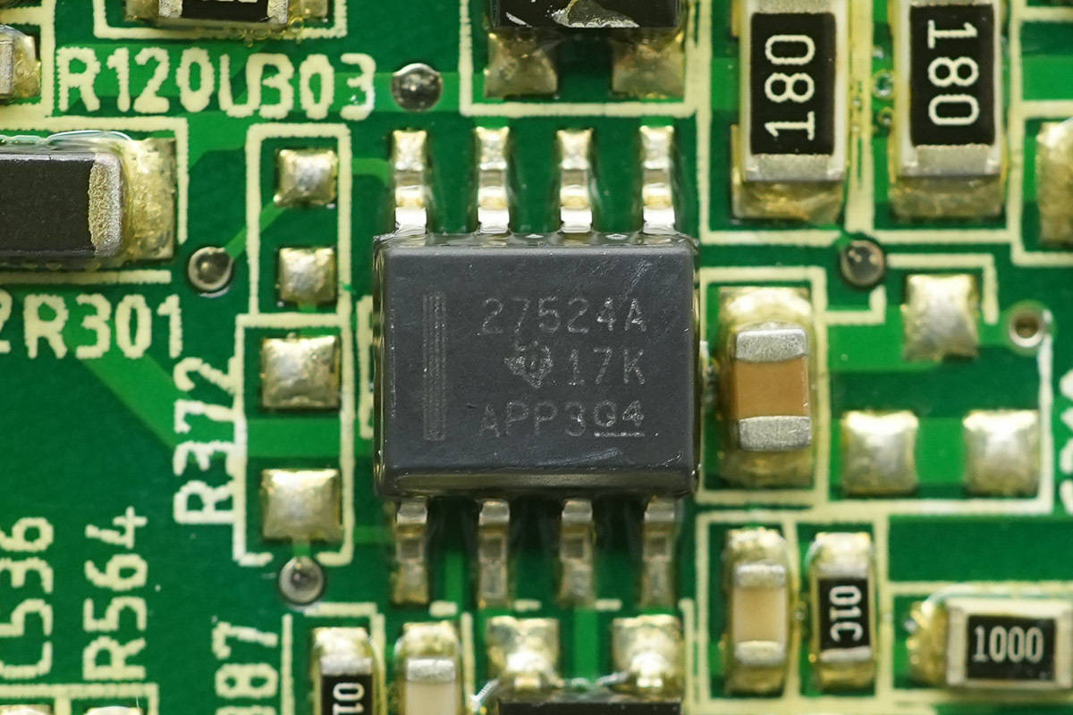 低侧驱动器来自德州仪器,型号UCC27524A,是一颗具有负输入电压能力的双通道5A高速低侧栅极驱动器,采用SOIC8封装。