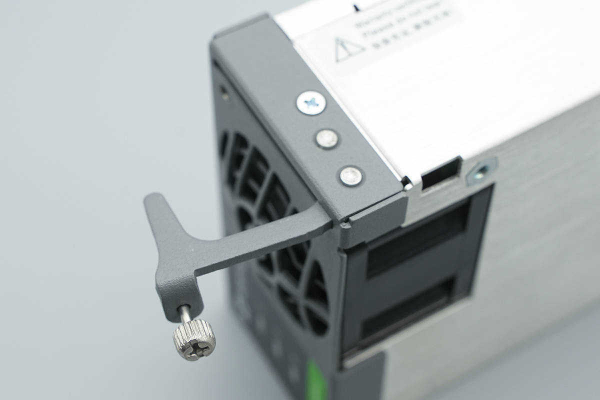 整流模块面板特写,左侧设有指示灯,右侧设有散热风扇和锁定把手。