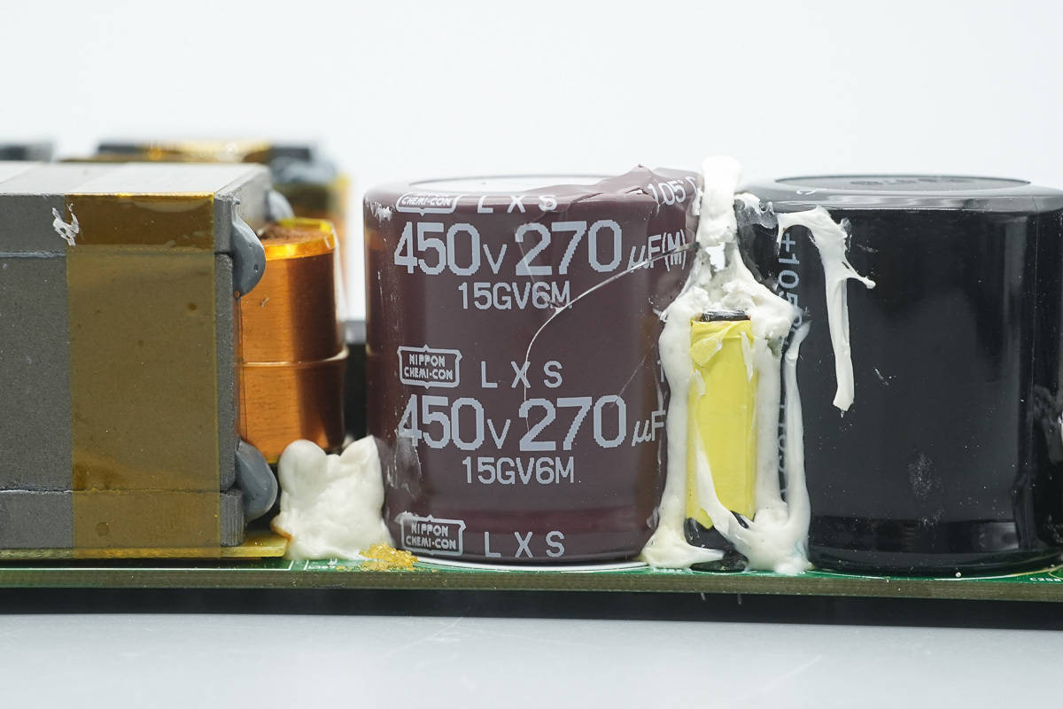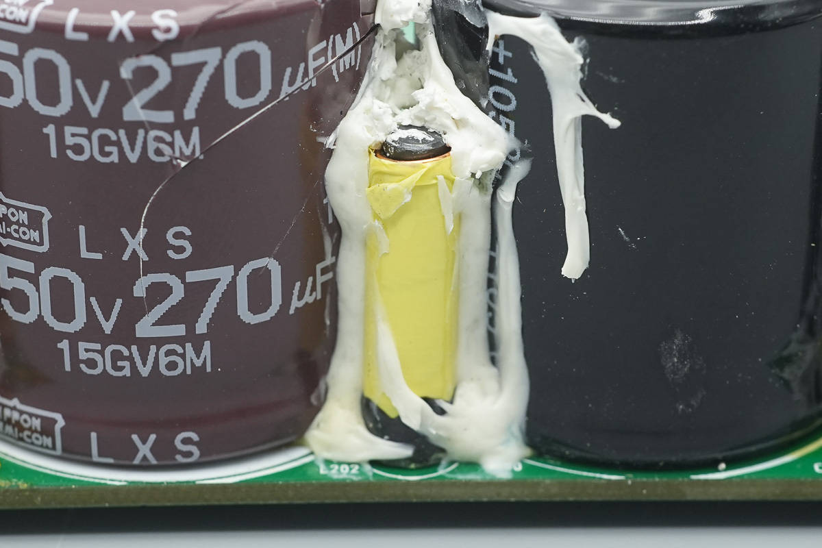 高压滤波电容来自贵弥功,为LXS系列105℃耐热,基板自立型电解电容,规格为450V270μF。