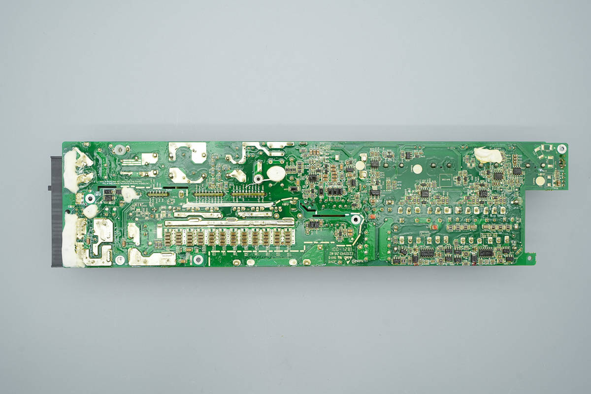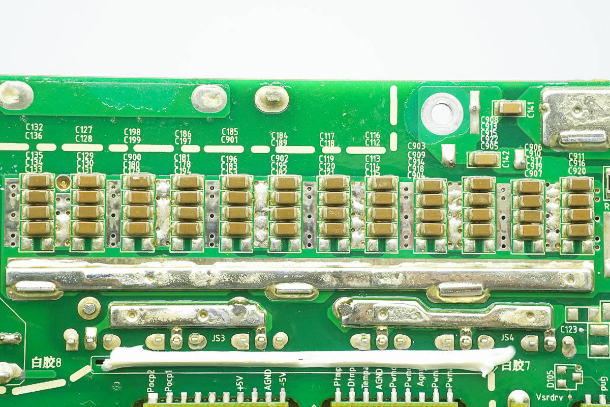 PCBA模块背面一览,左下角对应直流输出位置焊接铜排,中间位置设有辅助电源芯片,运放,驱动器芯片。