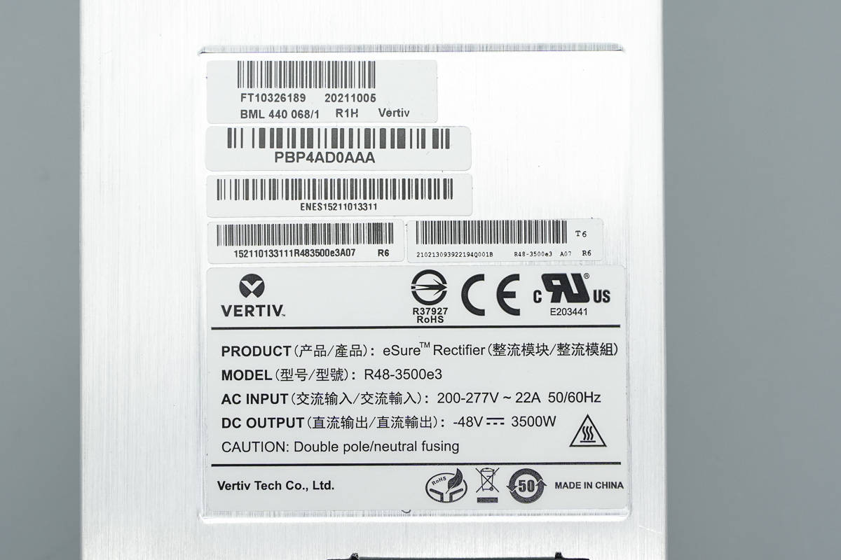 本期拆解带来的是维谛技术的一款3500W整流模块,维谛技术前身为艾默生网络能源,在2016年更名为维谛技术。这款整流模块型号为R48-3500e3,支持200-277Vac输入电压,输出为-48V直流,输出功率为3500W。