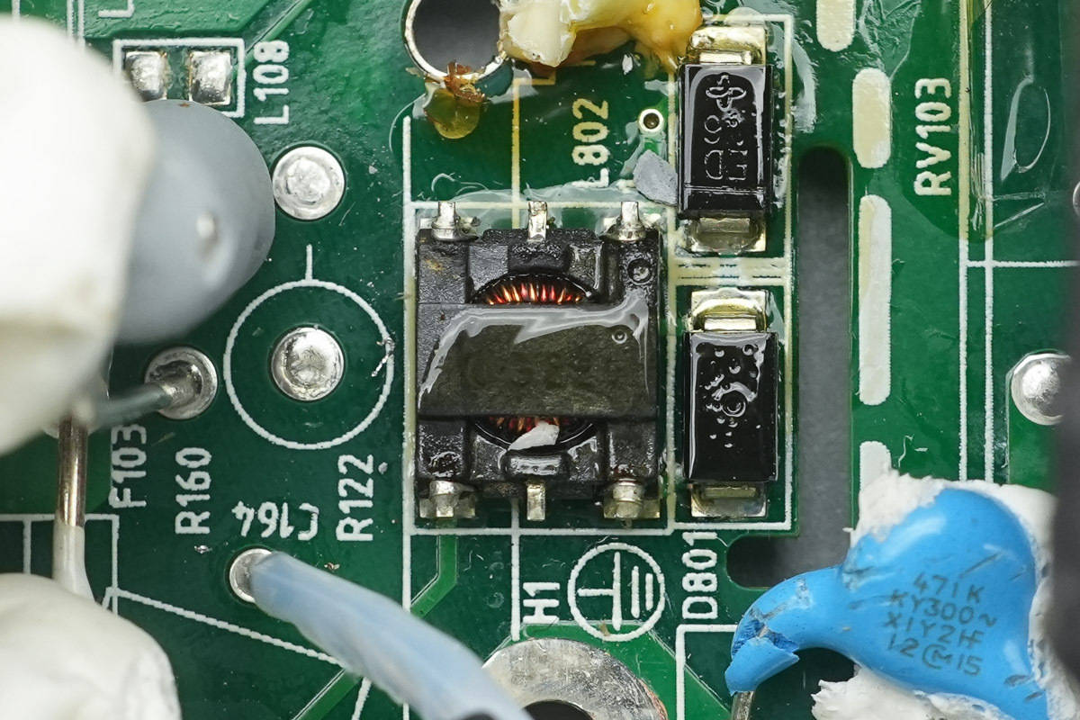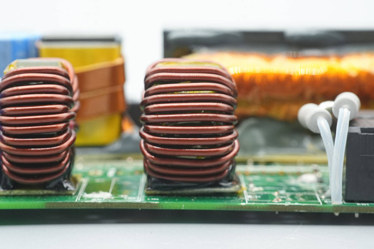另一颗共模电感同样采用漆包线绕制,底部设有电木板绝缘。