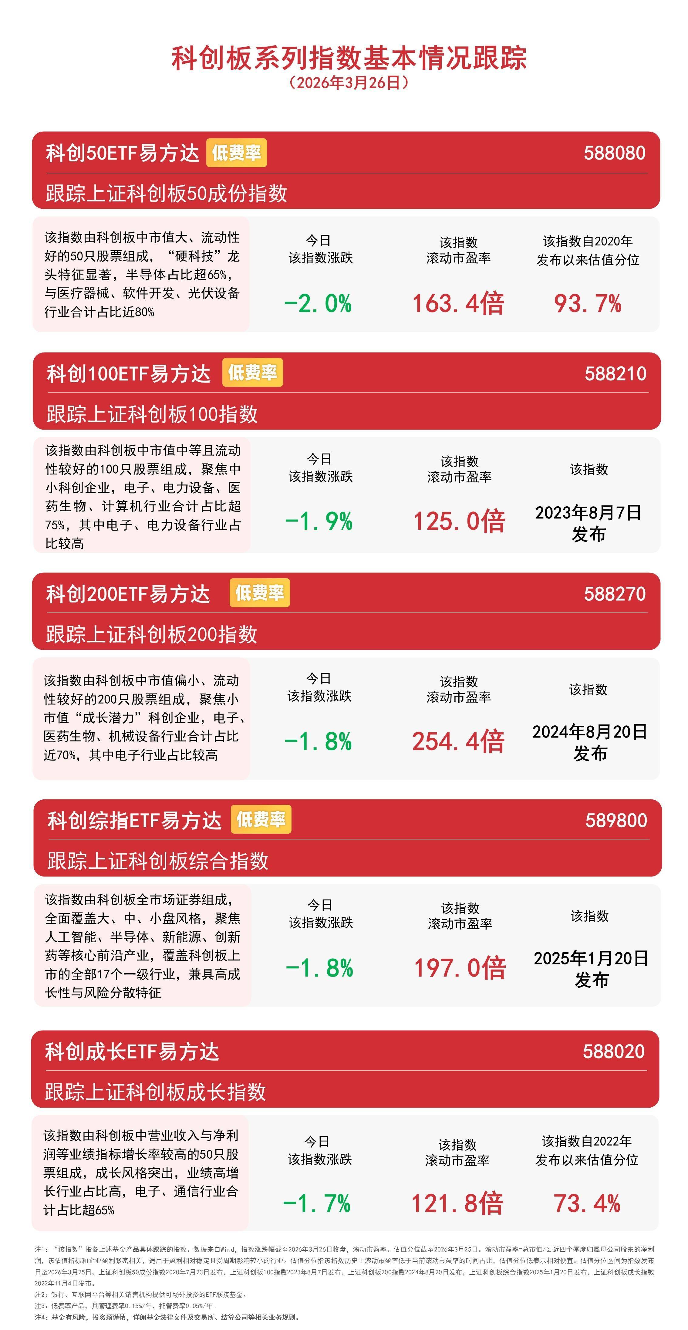 资金面显示,截至 3 月 25 日,跟踪科创 50 指数的科创 50ETF 易方达(588080,联接基金 A/C/Y:011608/011609/022895)近 5 个交易日合计净流入约 10 亿元。易方达旗下科创板系列 ETF 均为低费率品种。