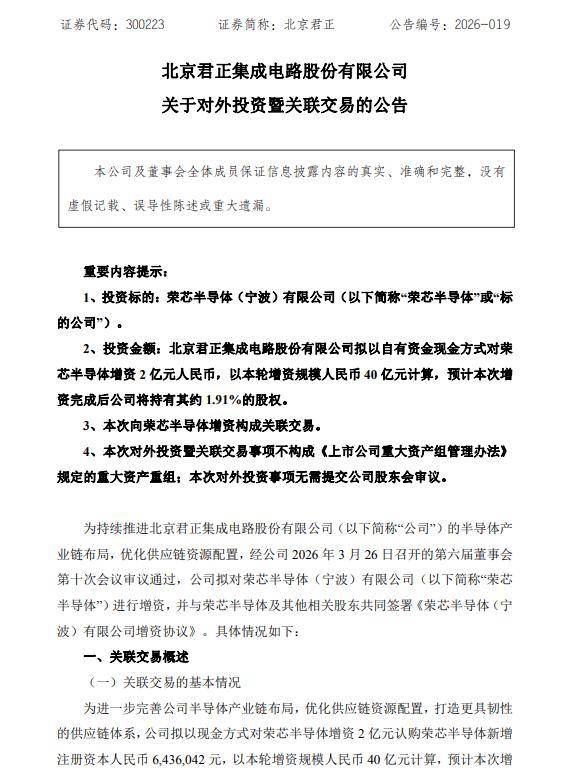 3月27日,北京君正(300223.SZ)公告称,公司拟以自有资金2亿元对荣芯半导体(宁波)有限公司进行增资,认购新增注册资本643.6万元。按本轮40亿元增资规模计算,增资完成后公司将持有荣芯半导体约1.91%股权。本次对荣芯半导体投资属于公司对半导体上游供应链的布局,有助于公司更好地拓展上游供应链资源。
