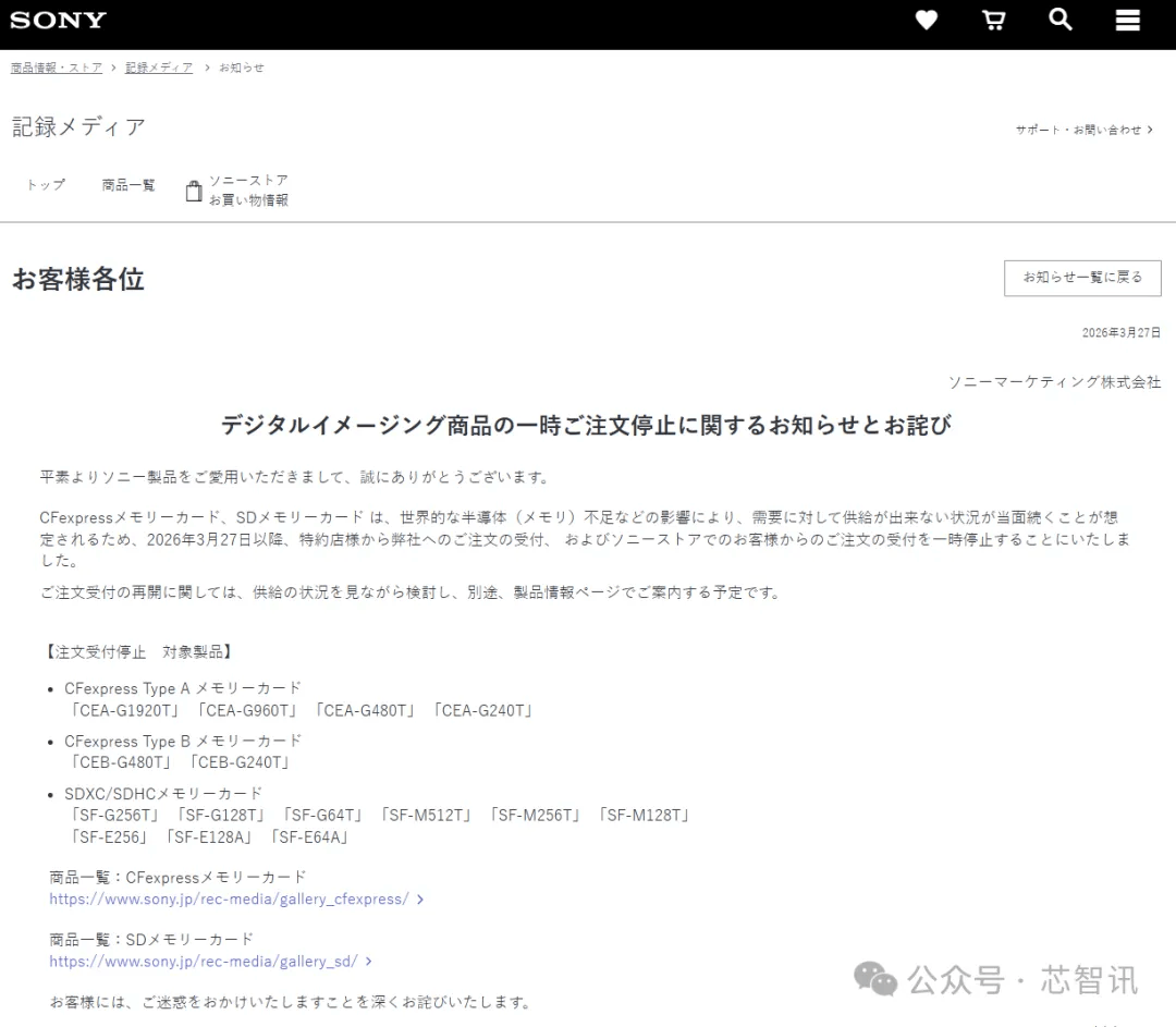 2026年3月27日,受全球存储芯片持续供不应求、价格飙升的影响,日本科技大厂索尼公司通过官网宣布,自2026年3月27日起暂停接受来自授权经销商和索尼商店客户的CFexpress存储卡和SD存储卡订单。