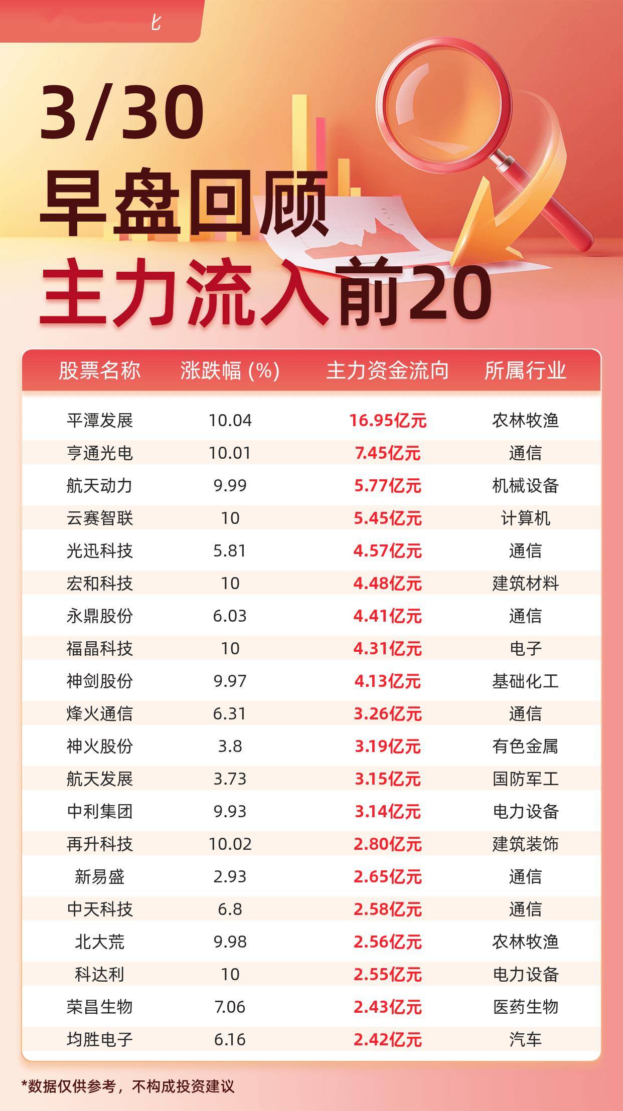 据交易所数据显示,截至3月30日午间收盘,主力资金流入前20的股票分别为: 平潭发展(16.95亿元)、 亨通光电(7.45亿元)、 航天动力(5.77亿元)、 云赛智联(5.45亿元)、 光迅科技(4.57亿元)、 宏和科技(4.48亿元)、 永鼎股份(4.41亿元)、 福晶科技(4.31亿元)、 神剑股份(4.13亿元)、 烽火通信(3.26亿元)、 神火股份(3.19亿元)、 航天发展(3.15亿元)、 中利集团(3.14亿元)、 再升科技(2.80亿元)、 新易盛(2.65亿元)、 中天科技(2.58亿元)、 北大荒(2.56亿元)、 科达利(2.55亿元)、 荣昌生物(2.43亿元)、 均胜电子(2.42亿元)。