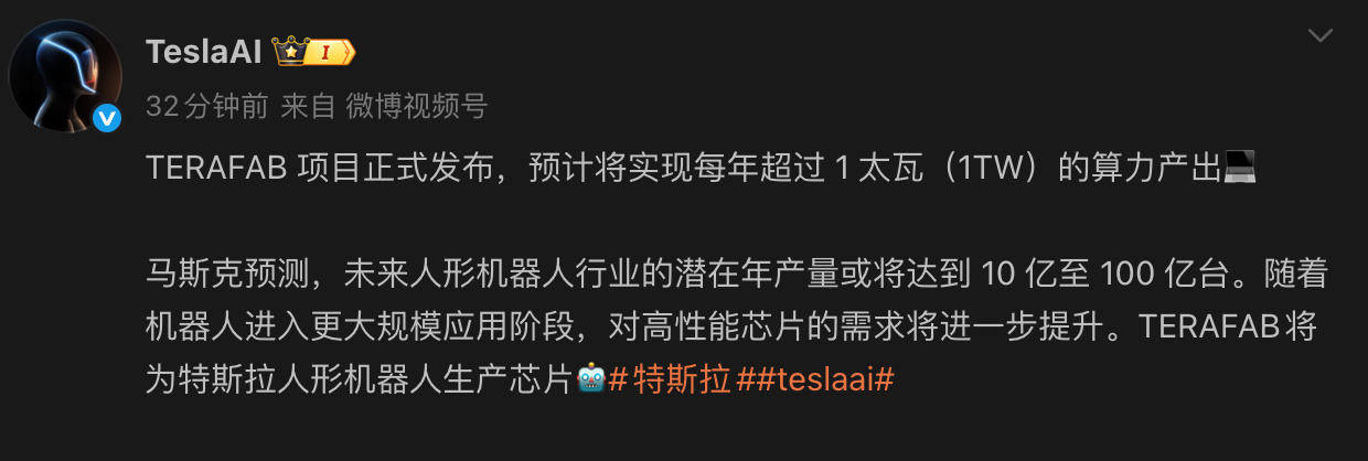 3月30日,TeslaAI官方微博发布消息称,正式启动TERAFAB超级芯片工厂项目,预计将实现每年超过1太瓦(1TW)的算力产出,这相当于当前全球AI芯片年总算力产出的约50倍。马斯克表示,这将是迄今为止历史上最宏大的芯片制造项目。