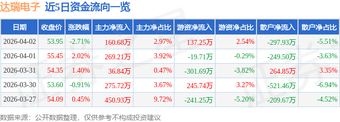 证券之星消息,截至2026年4月2日收盘,达瑞电子(300976)报收于53.95元,下跌2.71%,换手率1.15%,成交量9944.0手,成交额5404.41万元。