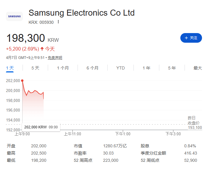 消息公布后,三星股价周二早盘一度涨4.6%至202,000韩元,跑赢大盘综合指数约2%的涨幅。现在涨幅收窄至3%以内。