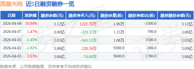 证券之星消息,截至2026年4月8日收盘,国星光电(002449)报收于8.33元,上涨10.04%,涨停,换手率4.83%,成交量29.88万手,成交额2.42亿元。