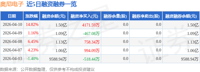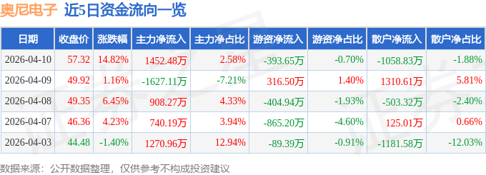 证券之星消息,截至2026年4月10日收盘,奥尼电子(301189)报收于57.32元,上涨14.82%,换手率9.08%,成交量10.15万手,成交额5.64亿元。