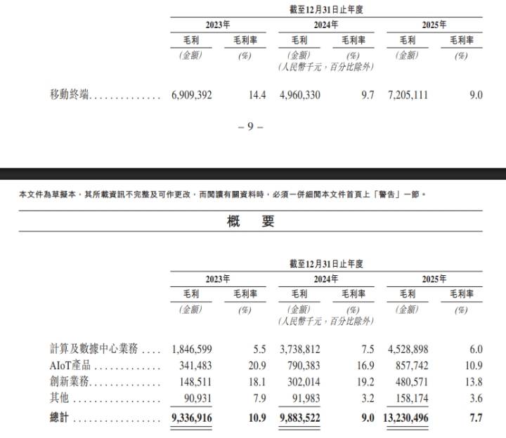 值得关注的是,公司毛利率近年来呈下滑趋势。根据招股书,公司毛利率从2023年的10.9%降至2024年的9%,2025年下降至7.7%。其中,2025年公司移动终端业务、计算及数据业务毛利率同比分别减少0.7个百分点、及1.5个百分点。