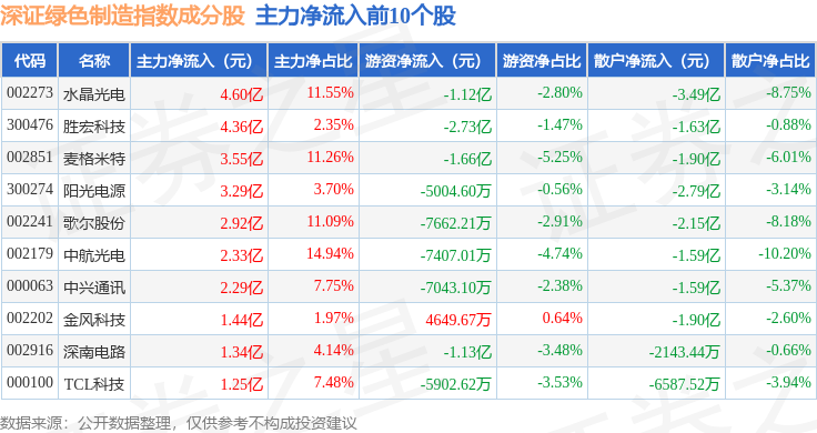 资金流向方面,深证绿色制造(970069)指数成份股当日主力资金净流出合计17.99亿元,游资资金净流入合计17.4亿元,散户资金净流入合计5903.18万元。成份股资金流向详情见下表: