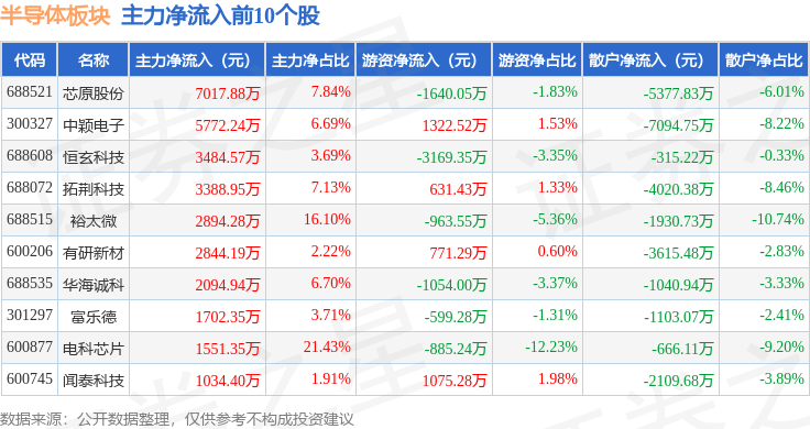 从资金流向上来看,当日半导体板块主力资金净流出49.19亿元,游资资金净流入20.83亿元,散户资金净流入28.36亿元。半导体板块个股资金流向见下表: