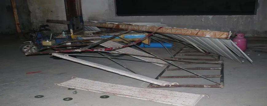 据悉,事故地点在凯希科技园23栋厂房西南角装卸口处。事发现场有一切断的槽钢、几块铁皮、坍塌的门式钢管脚手架压在一辆电动三轮车上,三块脚手板散落在地面。