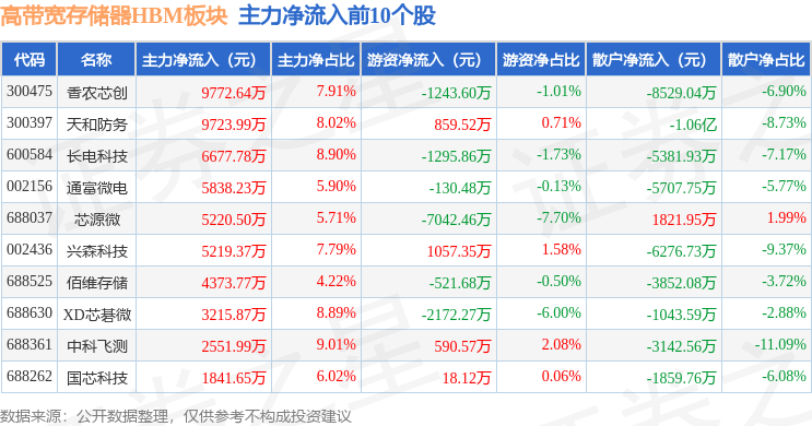 从资金流向上来看,当日高带宽存储器HBM板块主力资金净流入5.52亿元,游资资金净流出1.01亿元,散户资金净流出4.51亿元。高带宽存储器HBM板块个股资金流向见下表:
