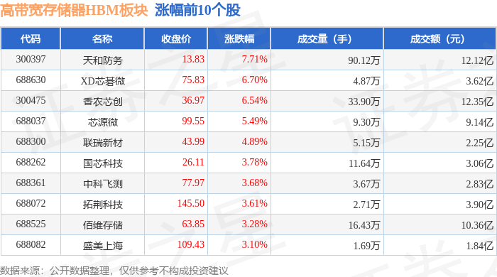 证券之星消息,6月18日高带宽存储器HBM板块较上一交易日上涨2.27%,天和防务领涨。当日上证指数报收于3388.81,上涨0.04%。深证成指报收于10175.59,上涨0.24%。高带宽存储器HBM板块个股涨跌见下表: