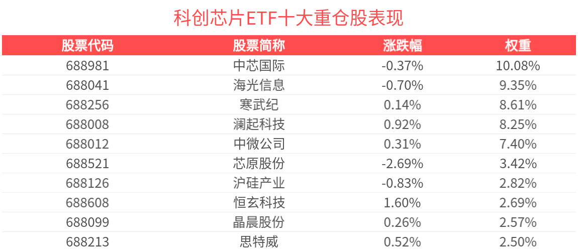 数据显示,截至2025年5月30日,上证科创板芯片指数前十大权重股分别为中芯国际、海光信息、寒武纪、澜起科技、中微公司、芯原股份、沪硅产业、恒玄科技、思特威(688213)、华润微(688396),前十大权重股合计占比57.93%。