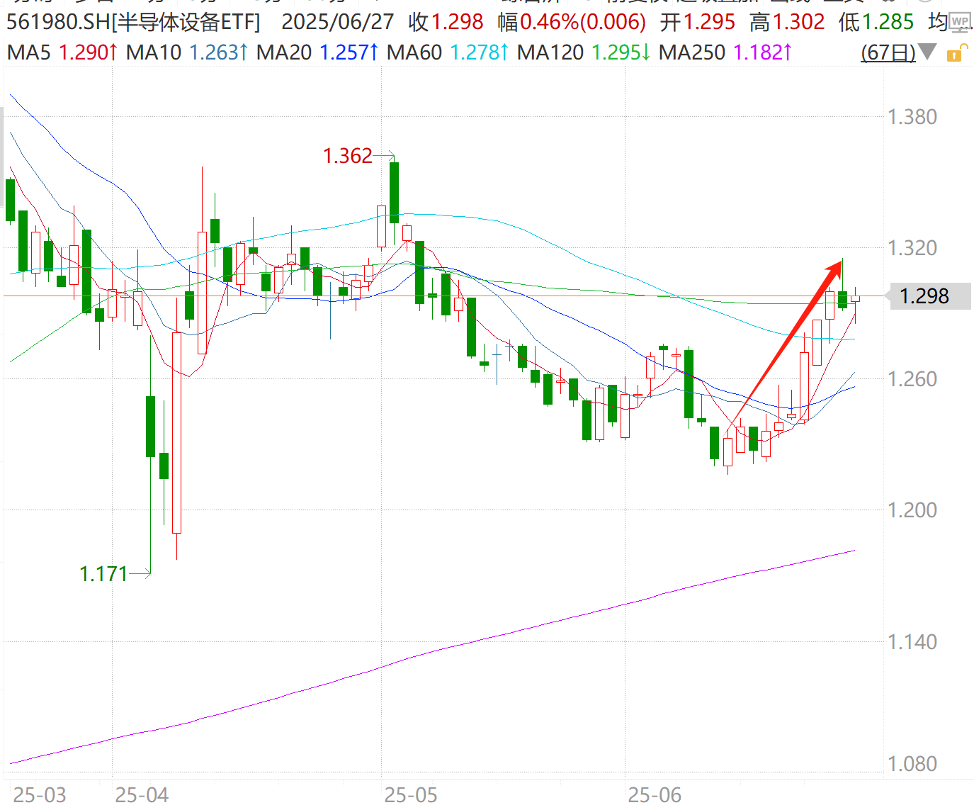 ETF方面,半导体产业链最上游的半导体设备ETF(561980)今天早盘震荡上行,截至收盘涨0.46%。从K线来看,目前ETF正处于自阶段底部上升的初期,后续空间有望全面打开。