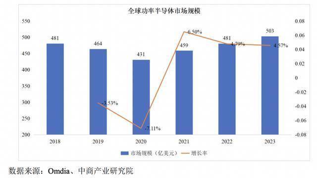 整体来看,全球功率半导体市场规模呈现波动增长的态势。根据Omdia调研统计,2018年至2022年全球功率半导体销售额小幅波动,2023年全球销售额增长至503亿美元。全球功率半导体市场规模发展状况如下图: