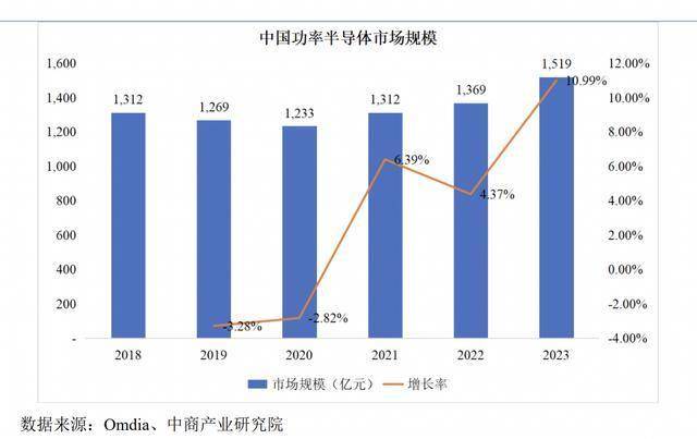 中国是全球最大的功率半导体消费国,根据Omdia调研统计,我国功率半导体产业销售收入由2020年的1233亿元增长至2022年的1369亿元,年均复合增长率为5.38%,2023年增长至1519亿元,增长率为10.99%,保持较高的增长速度。