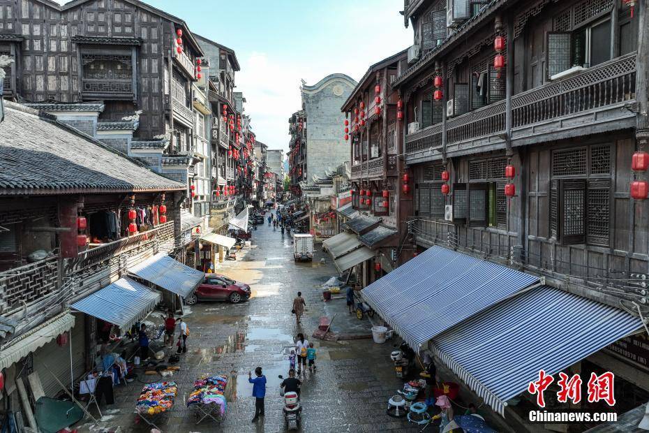 2025年6月底,受持续强降雨及上游来水叠加影响,贵州省黔东南苗族侗族自治州榕江县境内多条河流水位持续快速上涨,引发洪灾。灾情发生以来,各方救援力量全力抢险救灾,加快灾后重建。目前该县生产生活秩序逐渐恢复,县城重新焕发出生机与活力。中新社记者时隔14日再次来到榕江探访灾区民众生产生活情况。图为7月10日,航拍恢复后的贵州榕江老街。中新社记者 瞿宏伦 摄