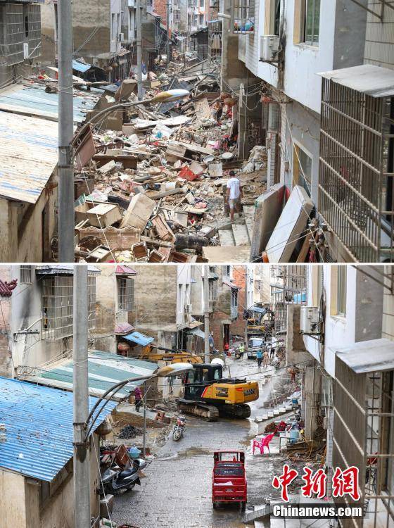 2025年6月底,受持续强降雨及上游来水叠加影响,贵州省黔东南苗族侗族自治州榕江县境内多条河流水位持续快速上涨,引发洪灾。灾情发生以来,各方救援力量全力抢险救灾,加快灾后重建。目前该县生产生活秩序逐渐恢复,县城重新焕发出生机与活力。中新社记者时隔14日再次来到榕江探访灾区民众生产生活情况。图为贵州榕江县城东门村6月26日灾前(上图)和7月10日灾后对比图。中新社记者 瞿宏伦 摄