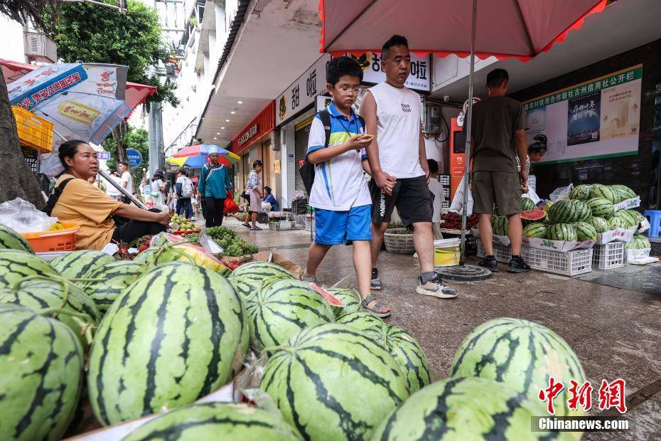 2025年6月底,受持续强降雨及上游来水叠加影响,贵州省黔东南苗族侗族自治州榕江县境内多条河流水位持续快速上涨,引发洪灾。灾情发生以来,各方救援力量全力抢险救灾,加快灾后重建。目前该县生产生活秩序逐渐恢复,县城重新焕发出生机与活力。中新社记者时隔14日再次来到榕江探访灾区民众生产生活情况。图为7月10日,居民路过贵州榕江江西码头农贸市场一水果摊贩。中新社记者 瞿宏伦 摄
