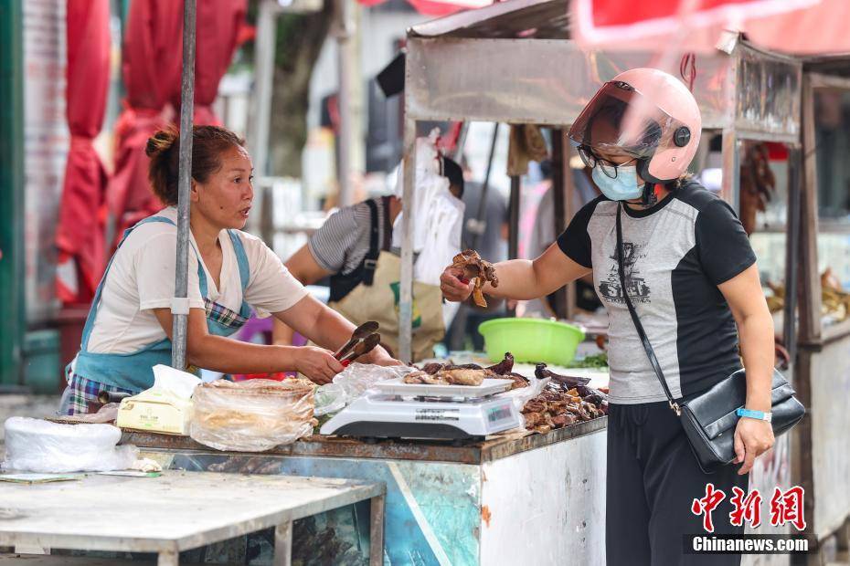 2025年6月底,受持续强降雨及上游来水叠加影响,贵州省黔东南苗族侗族自治州榕江县境内多条河流水位持续快速上涨,引发洪灾。灾情发生以来,各方救援力量全力抢险救灾,加快灾后重建。目前该县生产生活秩序逐渐恢复,县城重新焕发出生机与活力。中新社记者时隔14日再次来到榕江探访灾区民众生产生活情况。图为7月10日,居民在贵州榕江江西码头农贸市场选购卤制品。中新社记者 瞿宏伦 摄