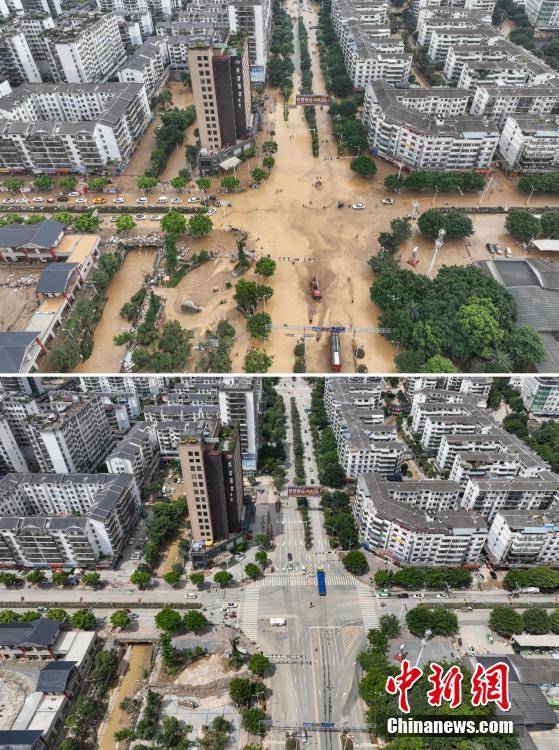 2025年6月底,受持续强降雨及上游来水叠加影响,贵州省黔东南苗族侗族自治州榕江县境内多条河流水位持续快速上涨,引发洪灾。灾情发生以来,各方救援力量全力抢险救灾,加快灾后重建。目前该县生产生活秩序逐渐恢复,县城重新焕发出生机与活力。中新社记者时隔14日再次来到榕江探访灾区民众生产生活情况。图为贵州榕江县城6月25日灾前(上图)和7月10日灾后对比图。中新社记者 瞿宏伦 摄