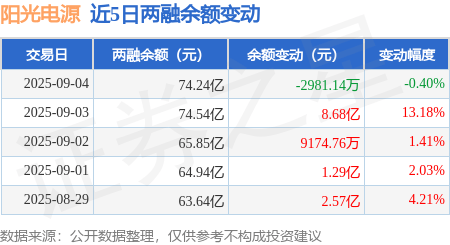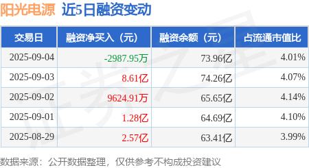 证券之星消息,9月4日,阳光电源(300274)融资买入26.6亿元,融资偿还26.9亿元,融资净卖出2987.95万元,融资余额73.96亿元,近20个交易日中有13个交易日出现融资净买入。