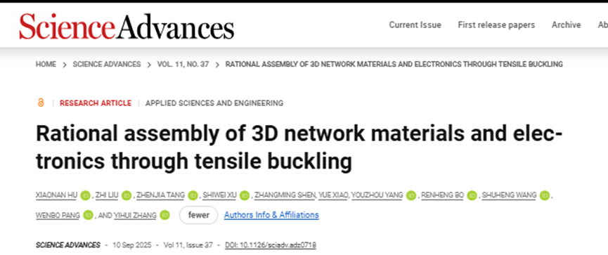 近日,清华大学航天航空学院、柔性电子技术国家级重点实验室张一慧课题组提出一种拉伸屈曲驱动的三维网状材料组装方法,为三维网状材料与高性能电子器件的集成提供了创新性解决方案。