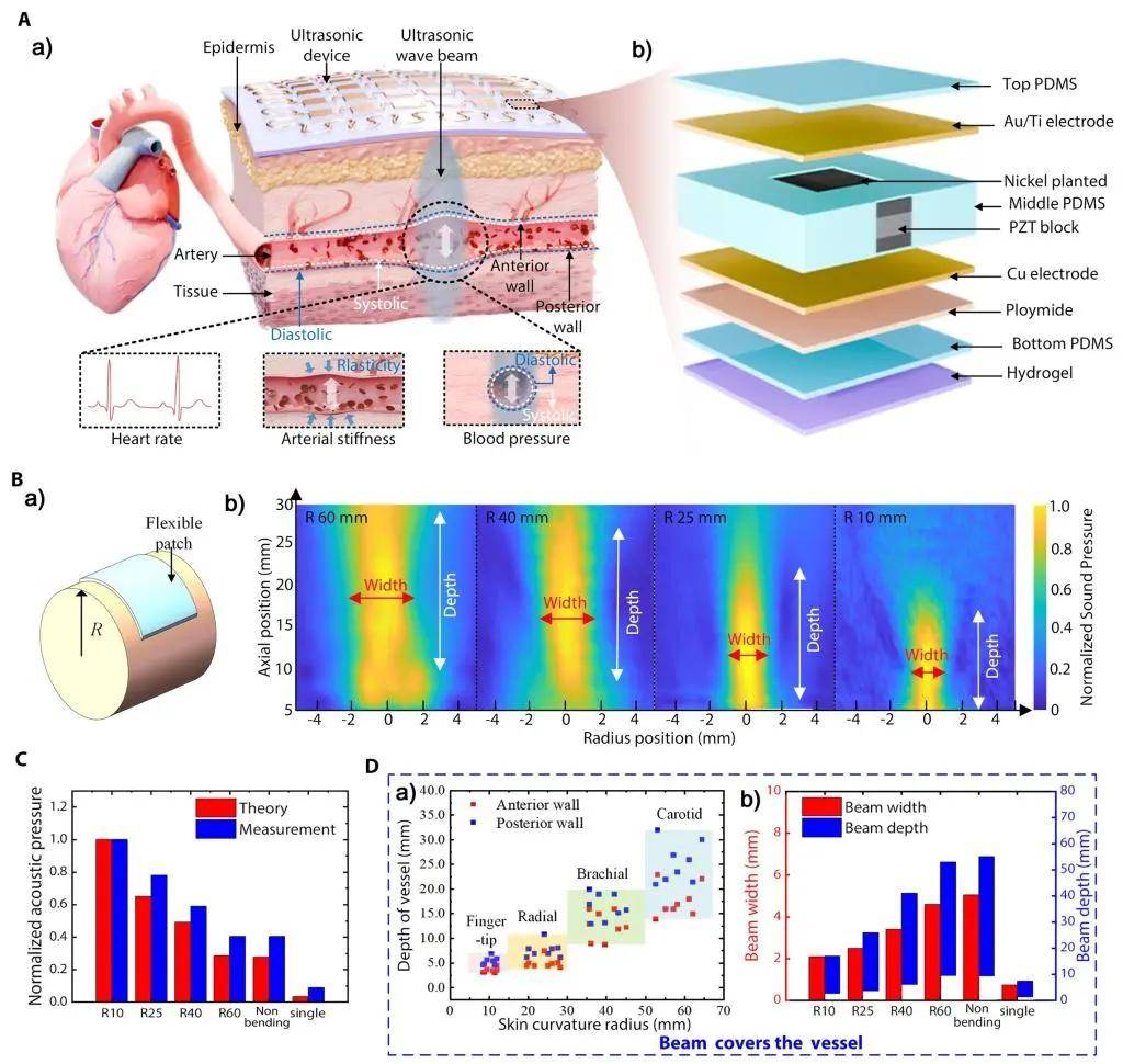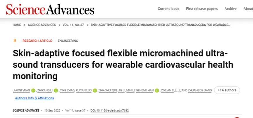 中国工程院院士、西安交通大学机械工程学院蒋庄德教授,仪器科学与技术学院赵立波团队和西安交通大学第一附属医院吕毅、吴荣谦教授团队等联合研发了一种皮肤自适应聚焦柔性微加工超声换能器阵列,可共形贴附于人体皮肤表面实现血压、心率、血管刚度等血流多参数的非侵入实时、连续检测,为心血管疾病的日常监测与早期预警提供了新技术、新希望。