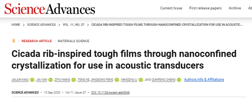 近期,中国科大苏州高等研究院仿生界面材料科学全国重点实验室程群峰教授课题组与中国科学院理化技术研究所李明珠研究员课题组合作在仿生限域组装及声学换能器应用研究领域取得重要突破,相关研究成果于9月10日以“Cicada rib-inspired tough films through nanoconfined crystallization for use in acoustic transducers”为题发表在国际期刊《Science Advances》上。