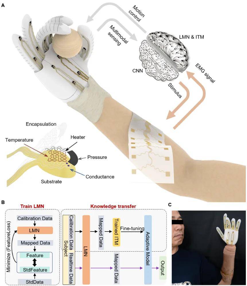9月10日,上海科技大学生物医学工程学院于游课题组和合作者在《科学进展》(Science Advances)上发表标题为“Printed sensing human-machine interface with individualized adaptive machine learning”的研究论文,报道了一种3D打印技术制备的多模态传感柔性生物电子,结合个体间自适应的机器学习算法,打通了从控制、手势识别到机器人触觉感知反馈的交互路径,并且进一步在智能假肢方面展现出巨大的应用潜力。