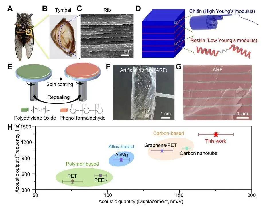 传统聚合物、金属及陶瓷声学换能器所用薄膜材料往往难以同时具备高强度、高韧性和优良的抗疲劳性能,这一局限性严重制约了声学换能器在高灵敏度响应和长期稳定性方面的表现。因此,开发综合性能优异、适用于高性能声学换能器的薄膜材料,仍是当前面临的重要技术挑战。针对该问题,本研究解析了蝉发声器官——蝉肋骨膜的结构与性能关系,并据此仿生制备出可用于声学换能器的高性能仿生薄膜。研究发现,蝉肋骨膜中软弹性蛋白层与硬几丁质层交替排列的结构是其优异力学性能的关键:硬质层有效承担机械负荷,软质层则通过大变形能力延缓裂纹扩展。