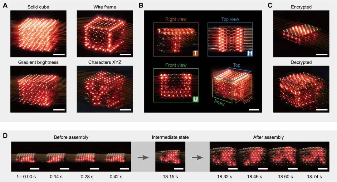 为此,张一慧课题组提出一种拉伸屈曲驱动的三维组装方法,该方法适用材料广泛,可兼容单晶硅等高性能无机电子材料,为三维网状材料与高性能电子器件集成提供了创新性解决方案。课题组提出了一种数据驱动的拓扑优化方法,优化了平面多层结构的面外变形能力,显著提升了组装效率。该方法制造的三维网状材料具有高度可调的仿生力学性能,能够模拟猪胸主动脉等生物组织的拉伸特性。课题组还基于该方法开发了体三维显示器件,该器件可动态显示三维图案,并能通过改变构型调整显示空间分辨率,实现图案的重构。