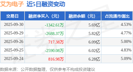 证券之星消息,9月30日,艾为电子(688798)融资买入6878.85万元,融资偿还8221.46万元,融资净卖出1342.61万元,融资余额5.69亿元。