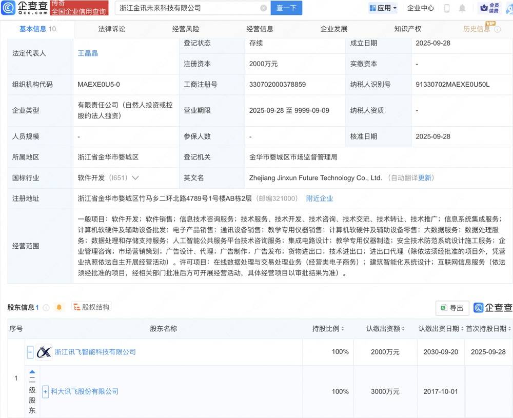企查查APP显示,近日,浙江金讯未来科技有限公司成立,法定代表人为王晶晶,注册资本2000万人民币,经营范围包括信息系统集成服务、人工智能公共服务平台技术咨询服务、集成电路设计等。企查查股权穿透显示,该公司由科大讯飞(002230)间接全资持股。