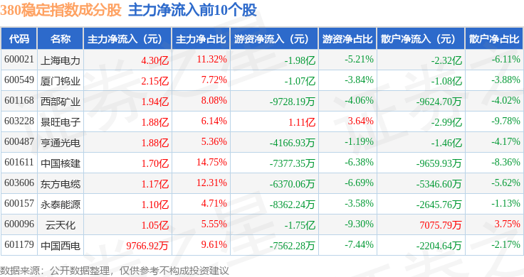 资金流向方面,380稳定(000142)指数成份股当日主力资金净流入合计8.78亿元,游资资金净流出合计5.07亿元,散户资金净流出合计3.71亿元。成份股资金流向详情见下表:
