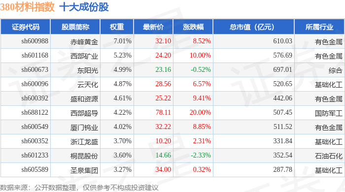 证券之星消息,10月9日,380材料(000105)指数报收于5197.73点,涨4.21%,成交450.65亿元,换手率3.35%。当日该指数成份股中,上涨的有33家,西部超导以20.0%的涨幅领涨,下跌的有16家,索通发展以3.27%的跌幅领跌。