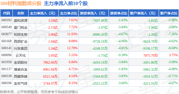资金流向方面,380材料(000105)指数成份股当日主力资金净流入合计9.21亿元,游资资金净流出合计7.8亿元,散户资金净流出合计1.41亿元。成份股资金流向详情见下表: