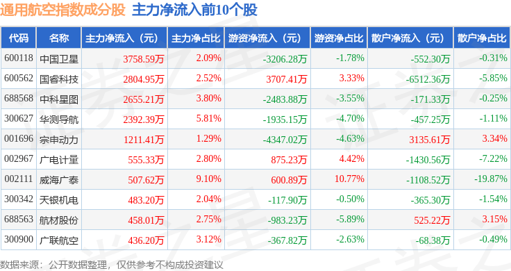 资金流向方面,通用航空(980076)指数成份股当日主力资金净流出合计8.33亿元,游资资金净流出合计6467.65万元,散户资金净流入合计8.98亿元。成份股资金流向详情见下表: