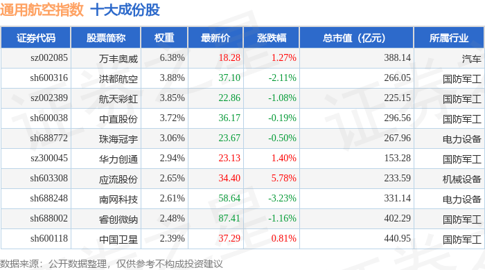 证券之星消息,10月9日,通用航空(980076)指数报收于3434.24点,涨1.26%,成交303.08亿元,换手率2.46%。当日该指数成份股中,上涨的有38家,西部超导以20.0%的涨幅领涨,下跌的有11家,南网科技以3.23%的跌幅领跌。