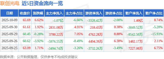 证券之星消息,截至2025年10月9日收盘,联创光电(600363)报收于65.69元,上涨6.62%,换手率5.4%,成交量24.5万手,成交额16.03亿元。
