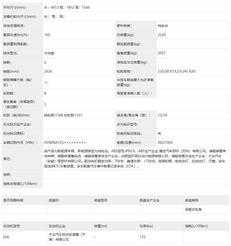 动力部分,与众07先期申报的车型采用单电机驱动,峰值功率输出170kW,搭载磷酸铁锂电池组,CLTC工况续航预计在600公里左右。