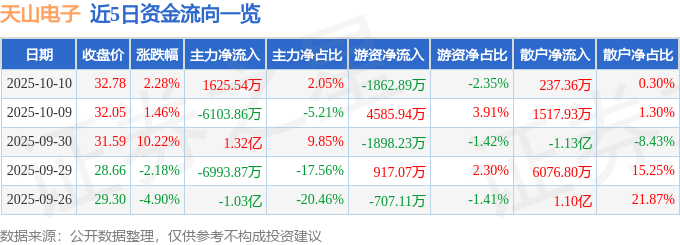 证券之星消息,截至2025年10月10日收盘,天山电子(301379)报收于32.78元,上涨2.28%,换手率19.59%,成交量24.94万手,成交额7.93亿元。