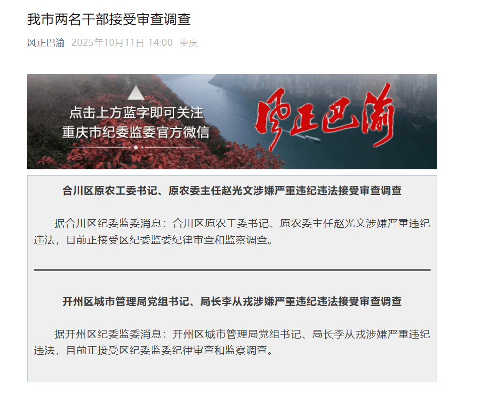 央广网重庆10月11日消息(记者白刁尹)10月11日,重庆市纪委监委机关公众号“风正巴渝”发布消息,重庆两名干部接受审查调查。合川区原农工委书记、原农委主任赵光文涉嫌严重违纪违法接受审查调查,开州区城市管理局党组书记、局长李从戎涉嫌严重违纪违法接受审查调查。